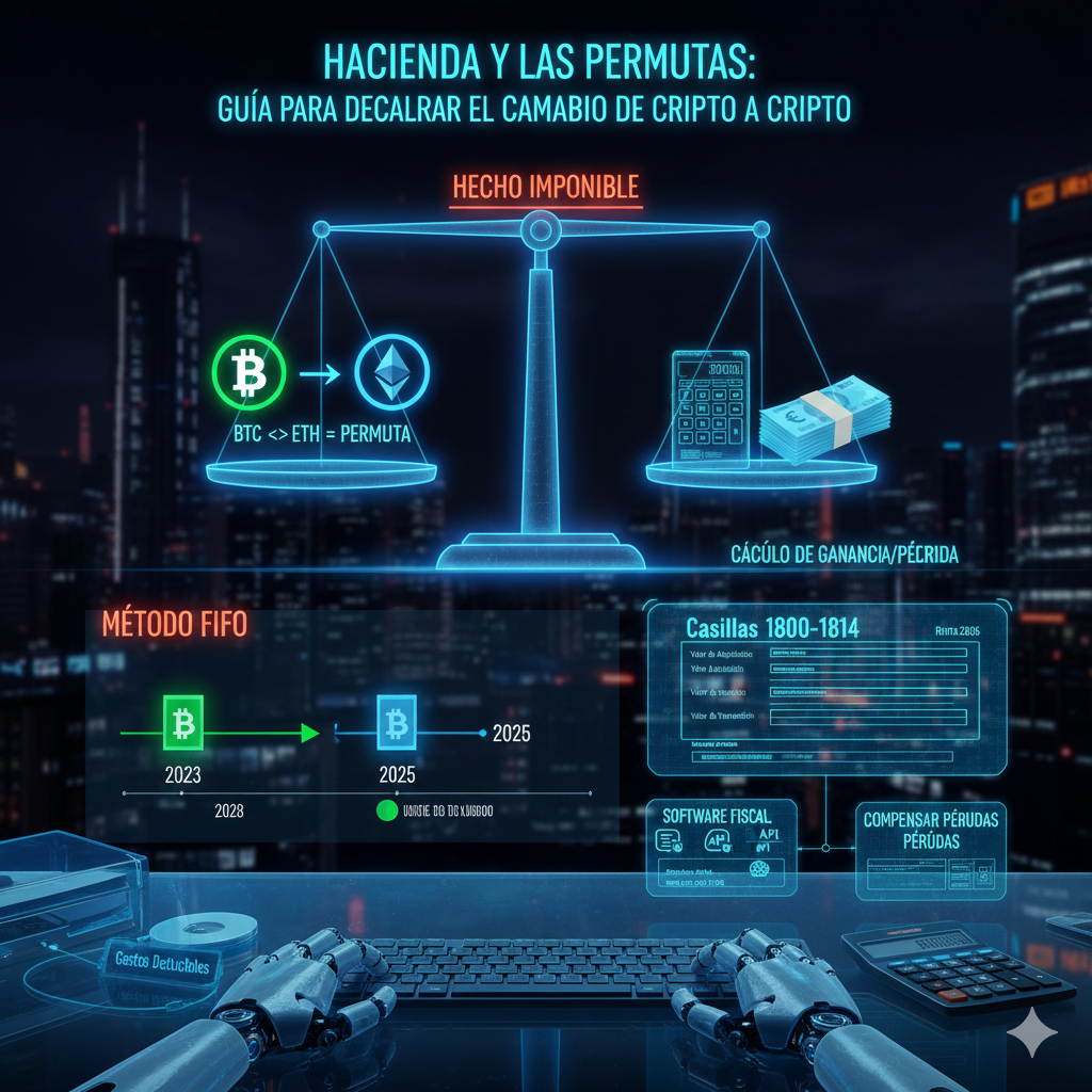 En el trading avanzado, es habitual saltar de Bitcoin a Ethereum, o de una altcoin a una stablecoin para refugiarse de la volatilidad. Cada uno de esos movimientos es, a ojos de Hacienda, una permuta de bienes inmateriales. Entender esto es vital para evitar que una inspección automática de la AEAT (Agencia Estatal de Administración Tributaria) arruine tu rentabilidad.